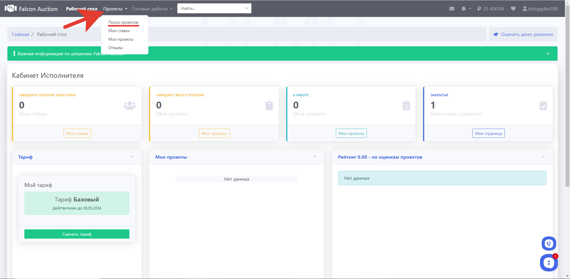 Зарегистрированный Исполнитель находит проект в каталоге.