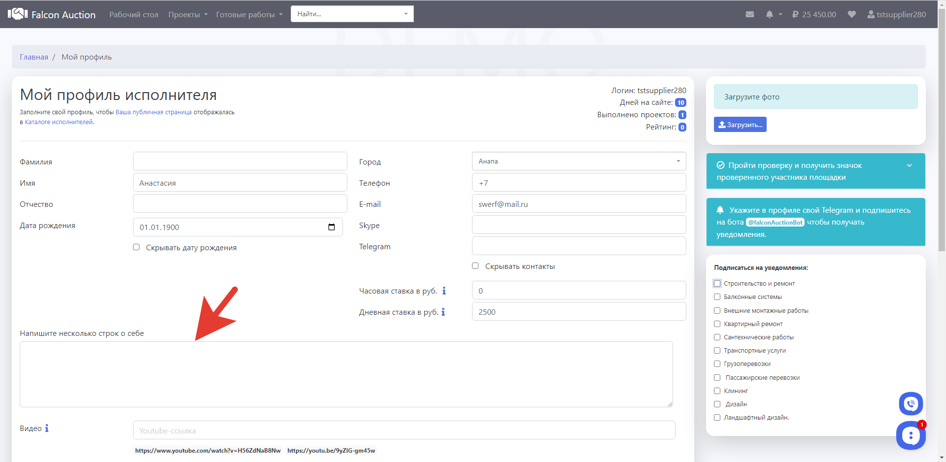 В оазделе "Мои проекты" воспользуйтесь кнопкой "Новый проект" и заполните форму. Обратите внимание, что нужно обязательно выбрать категорию для проекта. После сохранения Проект будет опубликован на Аукционе.