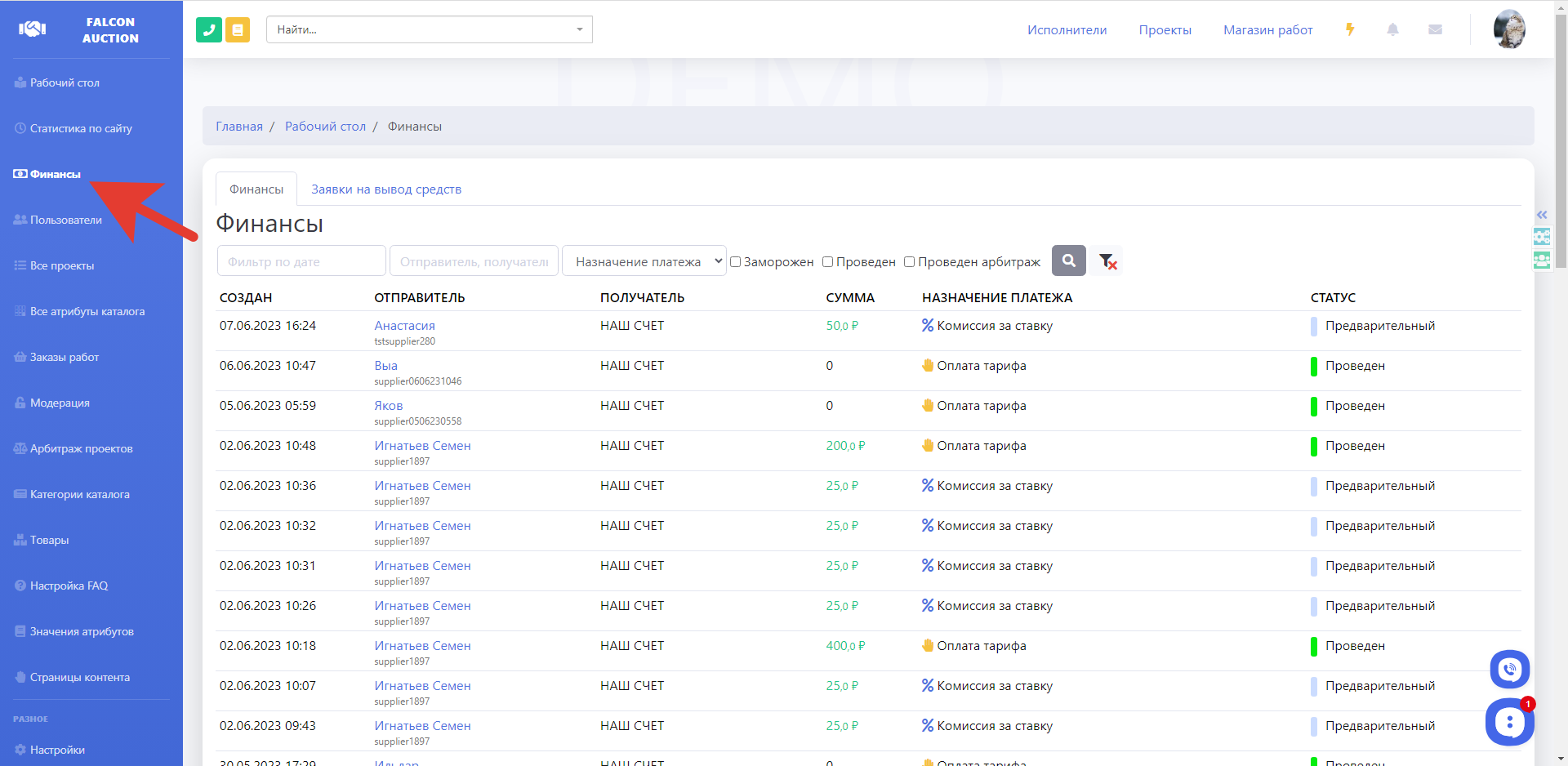 Движение денежных средств можно отслеживать в личном кабинете администратора сайта в разделе "Финансы".