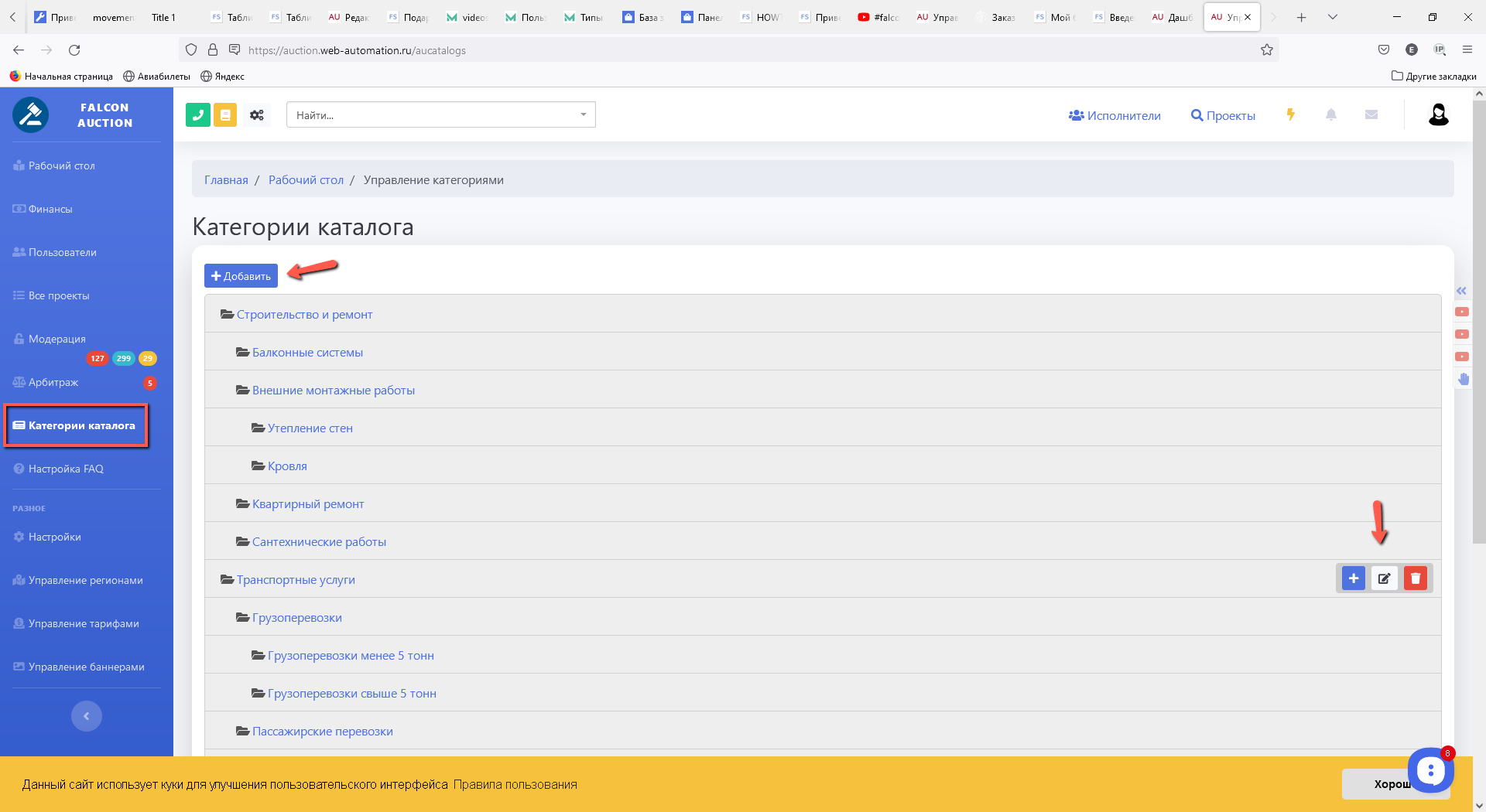 В кабинете Администратора переходим на страницу "Категории каталога", для создания новой категории нажимаем "Добавить", либо выбираем нужный элемент каталога для его редактирования.