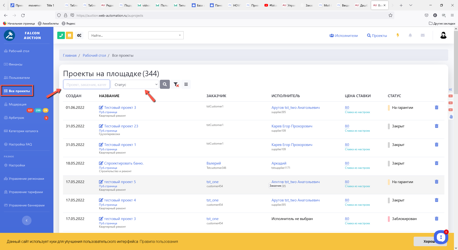 Как найти нужный проект или пользователя в кабинете администратора площадки