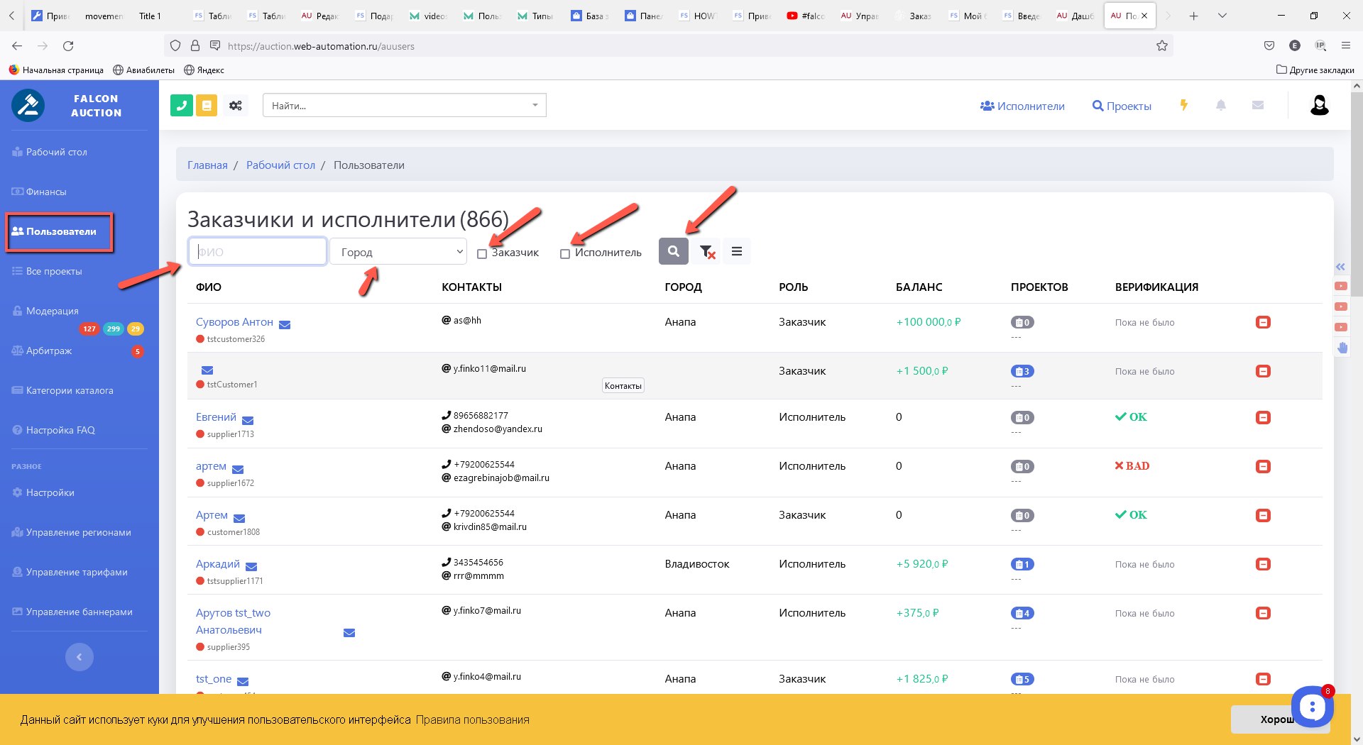Поиск нужного пользователя осуществляется на странице "Пользователи". Фильтры служат для быстрой сортировки и поиска нужного типа пользователей (Заказчик, Исполнитель), а также для выбора города.