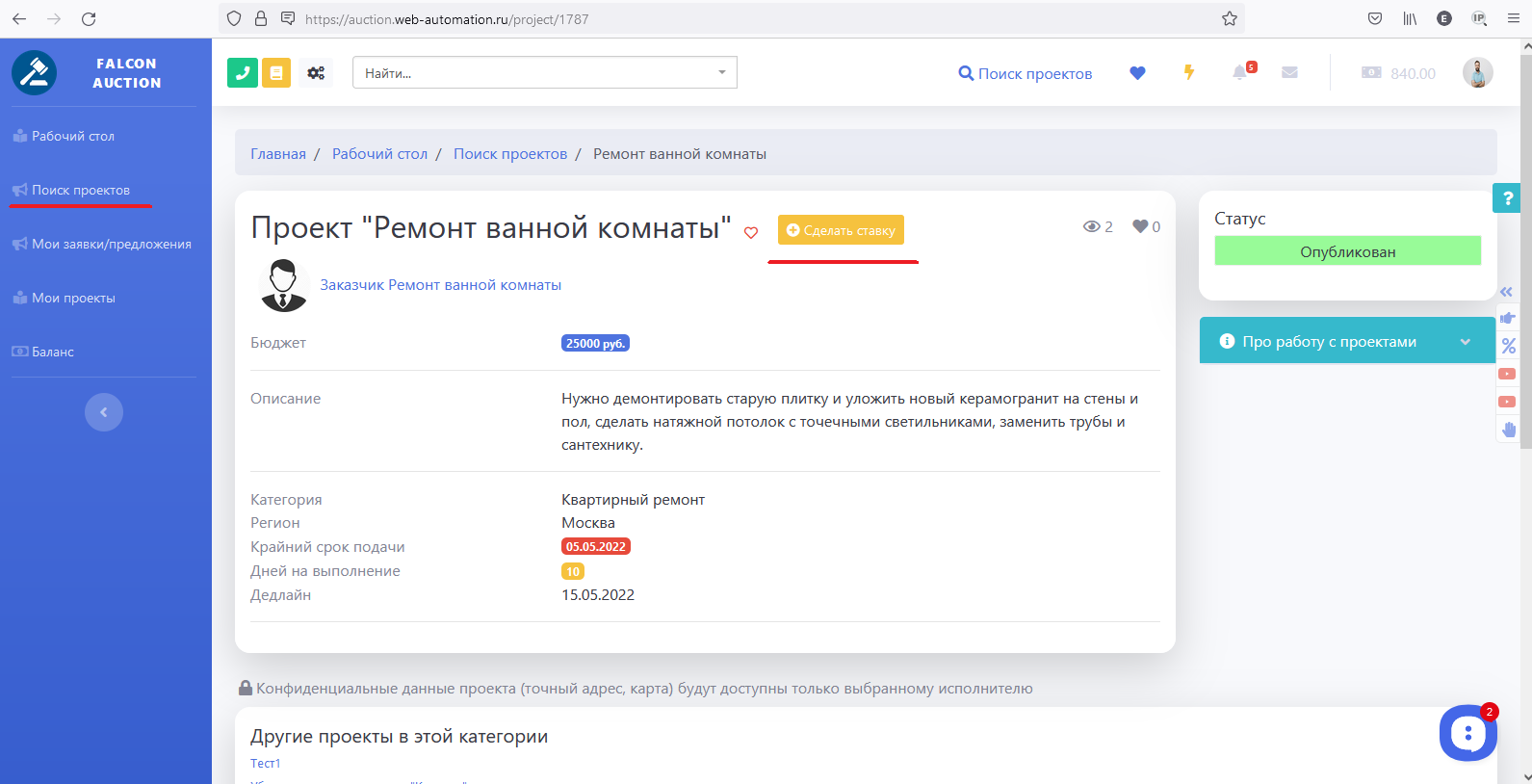 В личном кабинете Исполнителя переходим в меню "Поиск проектов", выбираем нужный проект, переходим в карточку проекта и нажимаем на кнопку "Сделать ставку":