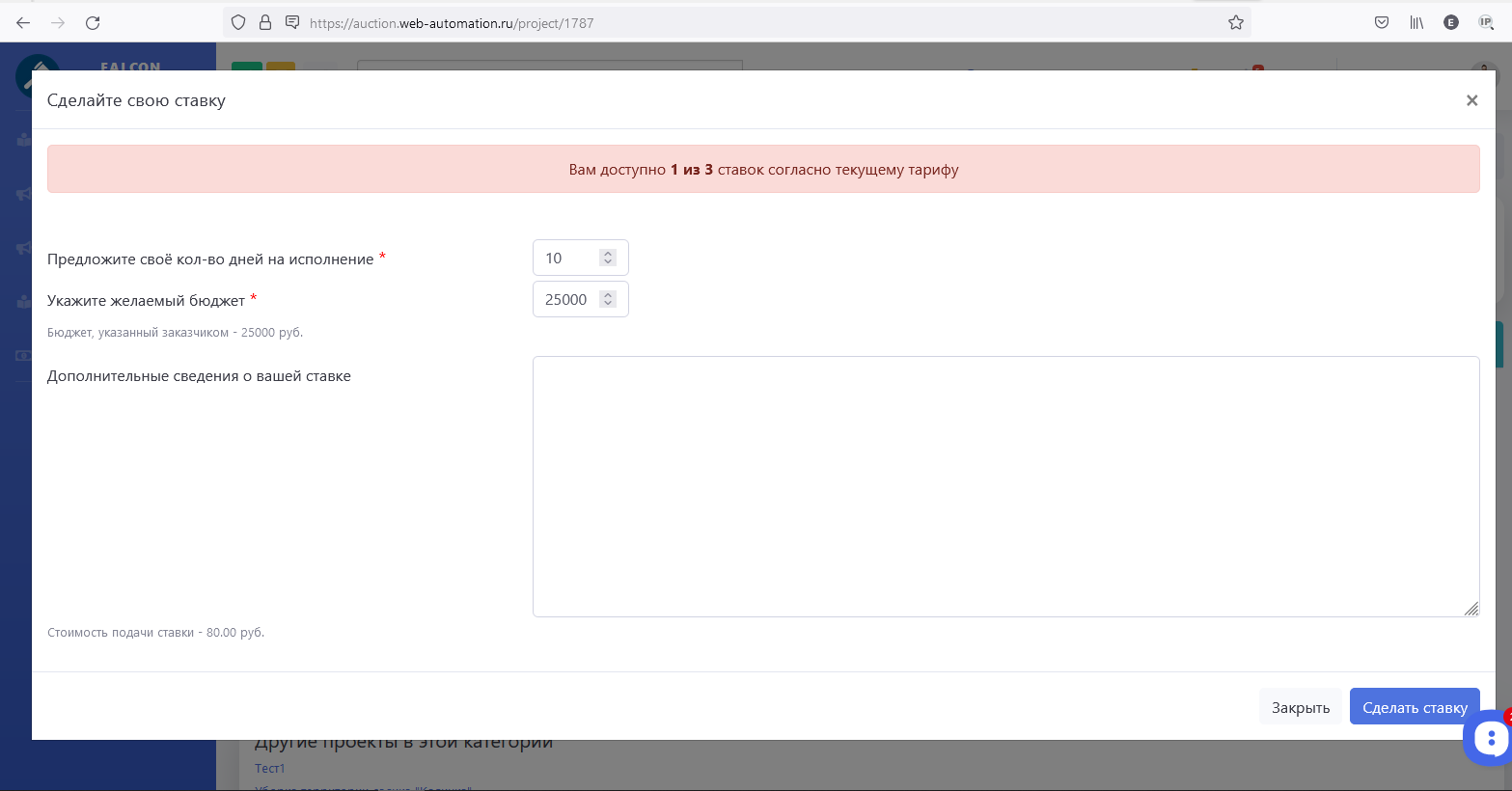 В открывшейся форме заполняем нужные поля и нажимаем кнопку "Сделать ставку" (для того чтоб сделать ставку у Исполнителя на балансе должно быть достаточно средств):