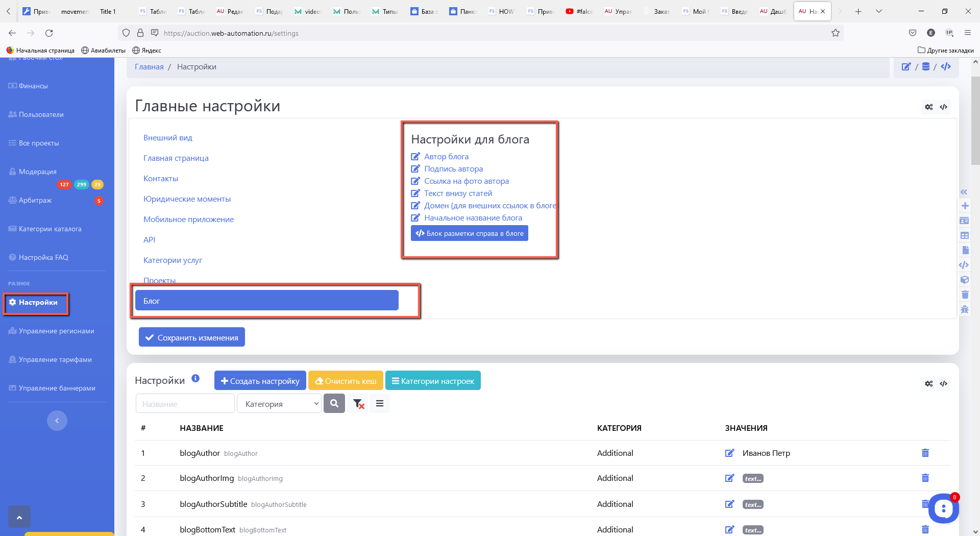 На странице "Настройки" выбираем вкладку "Блог" и редактируем нужные данные - название, автор и т.д.: