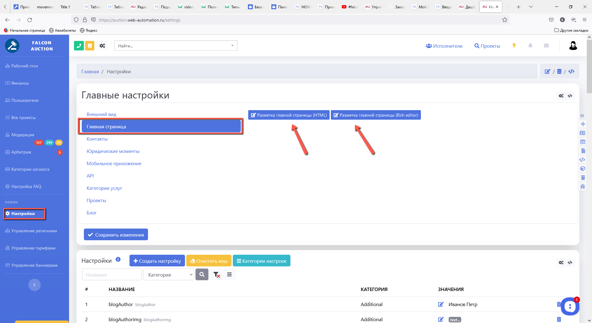 Для редактирования главной страницы нужно перейти на страницу "Настройки" (/settings) и выбрать вкладку "Главная страница", затем выбираем "Разметка главной страницы (HTML) или Разметка главной страницы (Rich editor)"