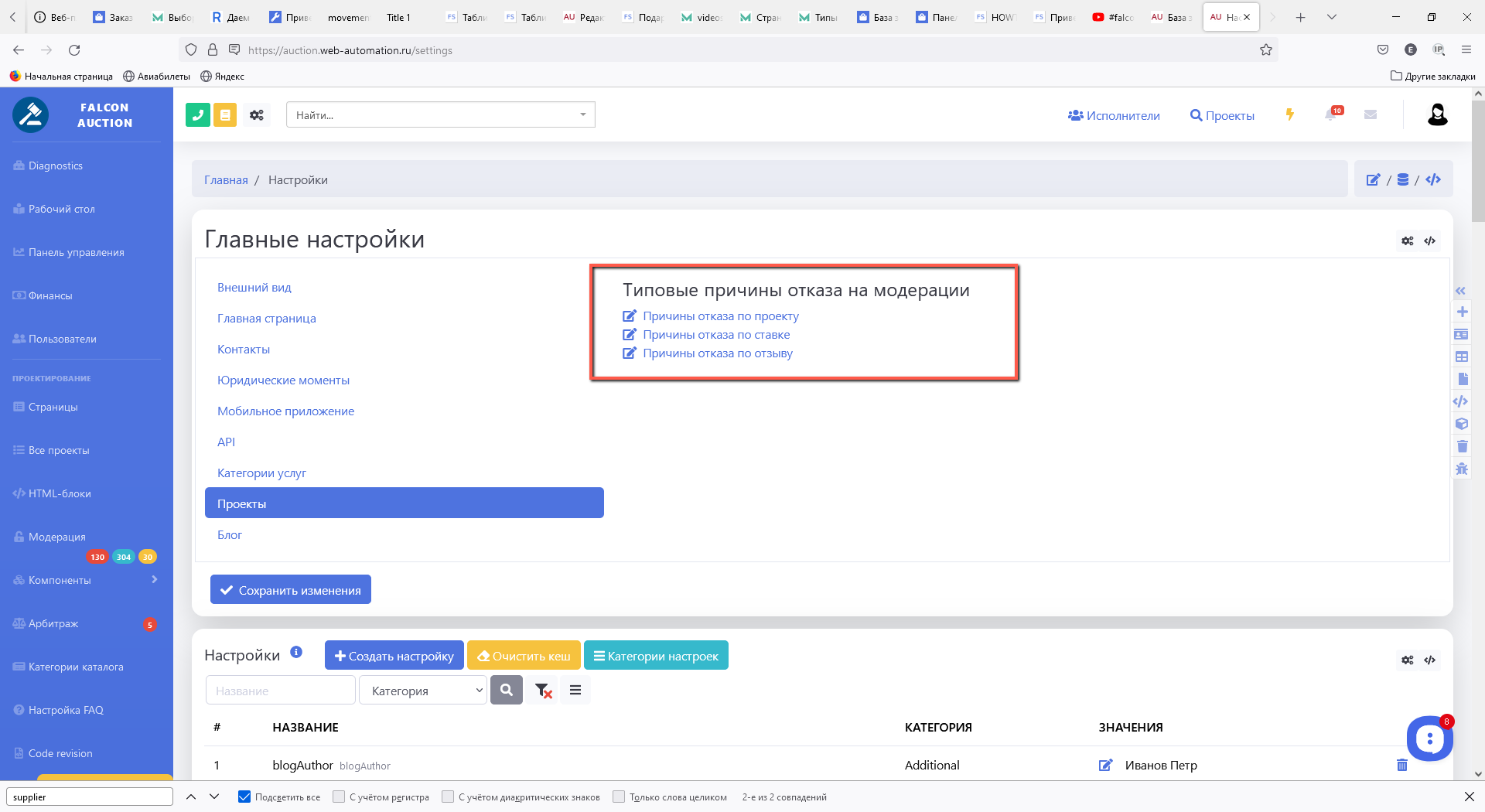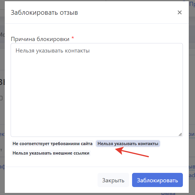 При блокировке проектов, ставок и отзывов обычно причины примерно одни и те же. В формах блокировки есть вывод типовых подсказок для быстрой подстановки.