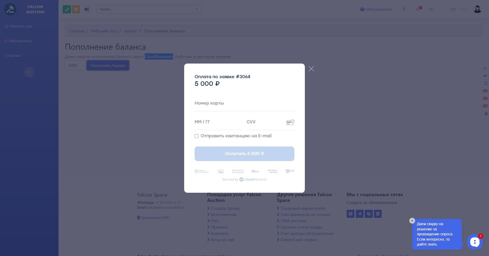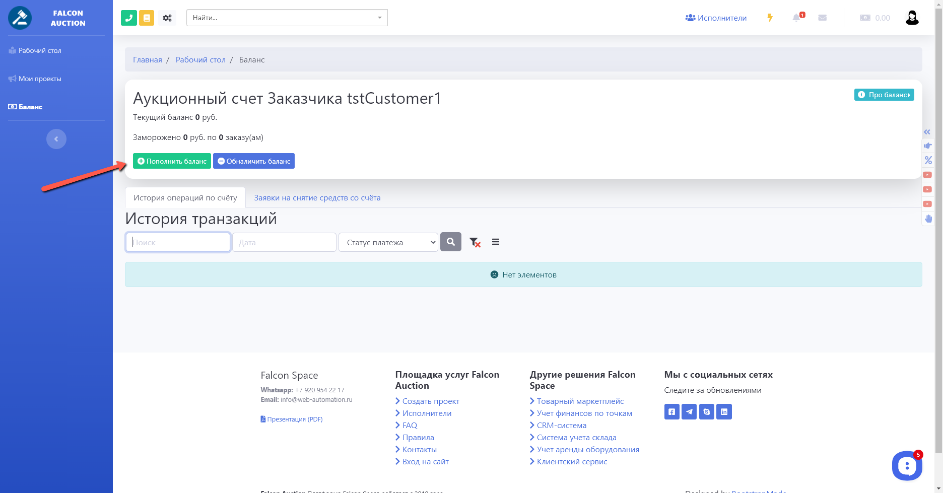 После регистрации на площадке Исполнителю и Заказчику требуется пополнить баланс (Исполнителю, чтоб делать ставки на проектах, Заказчику, чтоб мог выбрать нужного Исполнителя для участия в проекте и для оплаты услуг Исполнителя).