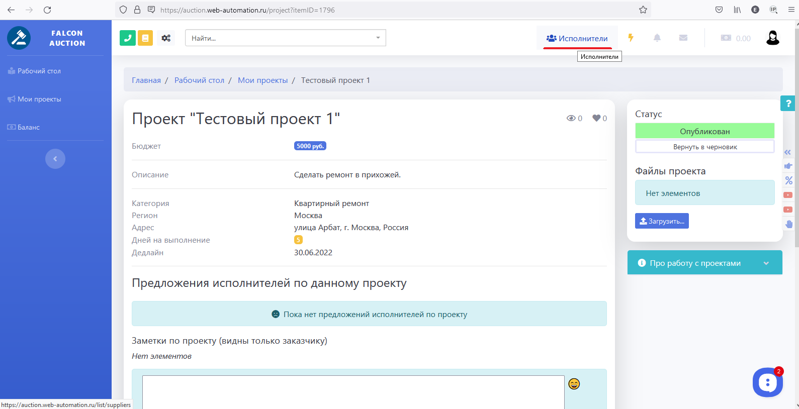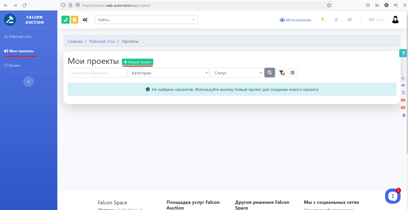 Для этого в личном кабинете Заказчика нужно выбрать пункт меню "Мои проекты" и создать "Новый проект":