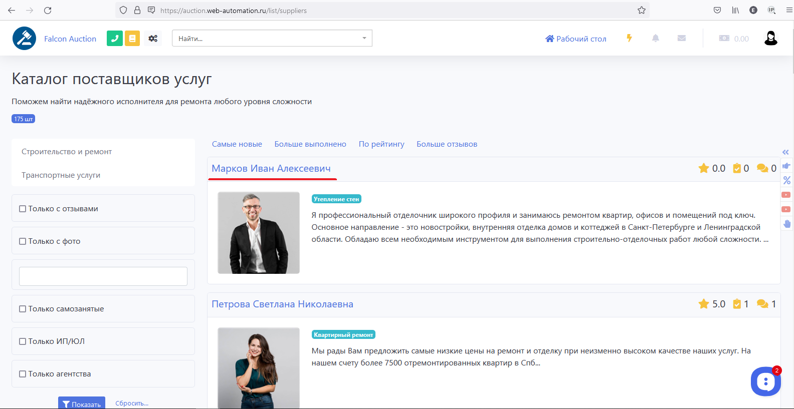 В каталоге, для удобства поиска, можно воспользоваться различными фильтрами. Далее выбираем нужного Исполнителя и переходим в его карточку: