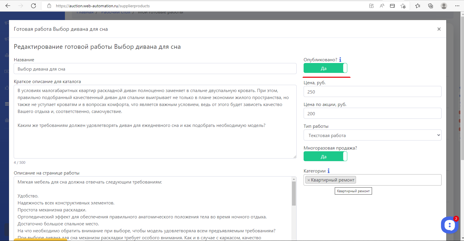 Для этого он снимает переключатель Публикация в форме редактирования работы в своем личном кабинете.