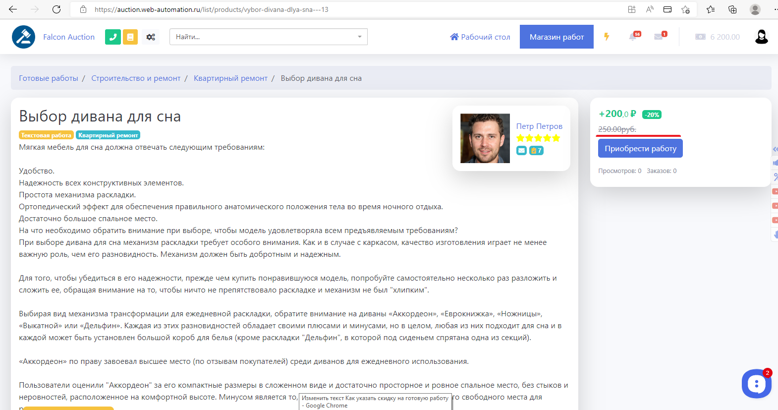 Скидку на работу указывает Исполнитель в своем кабинете на странице описания работы.