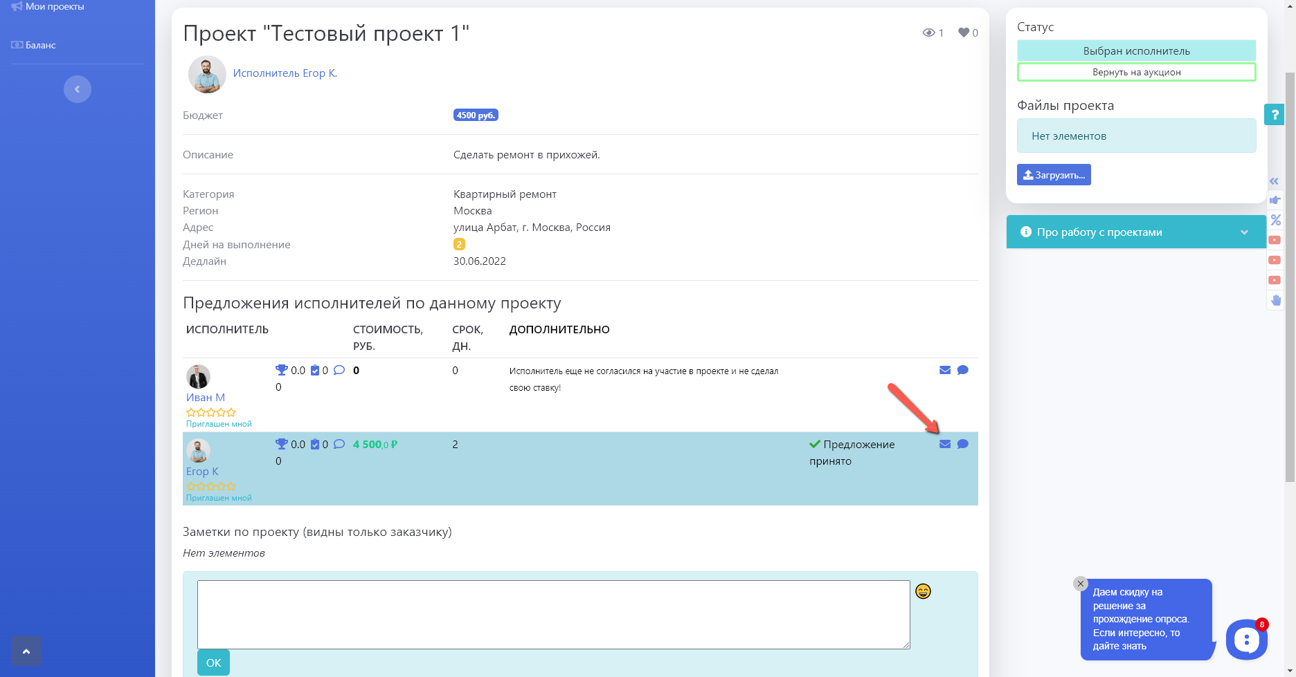 Заказчик, в меню "Мои проекты", выбирает нужный проект, нажимает на кнопку "Написать сообщение":