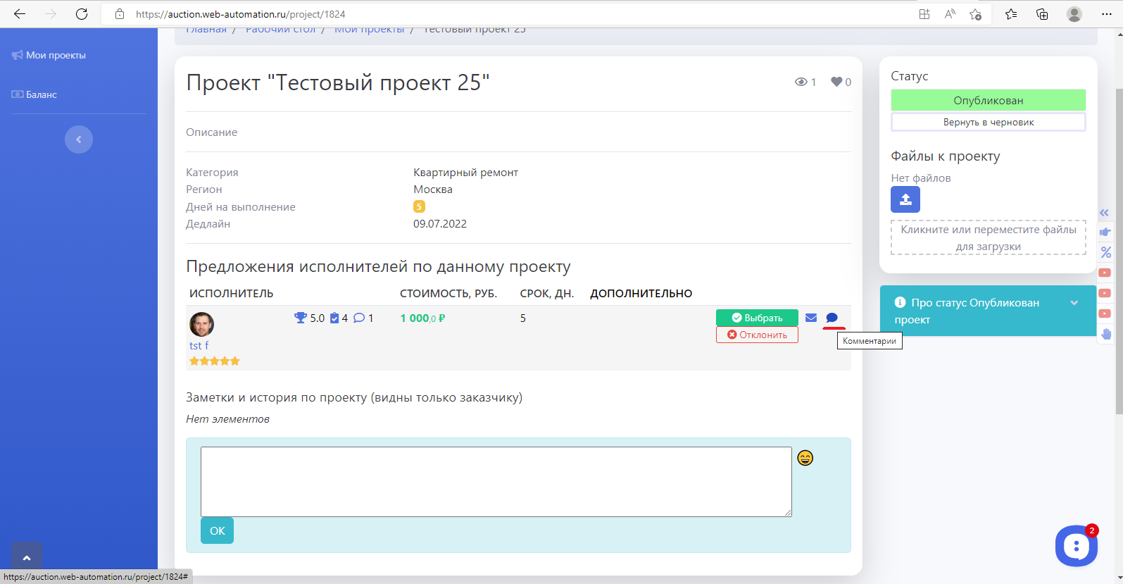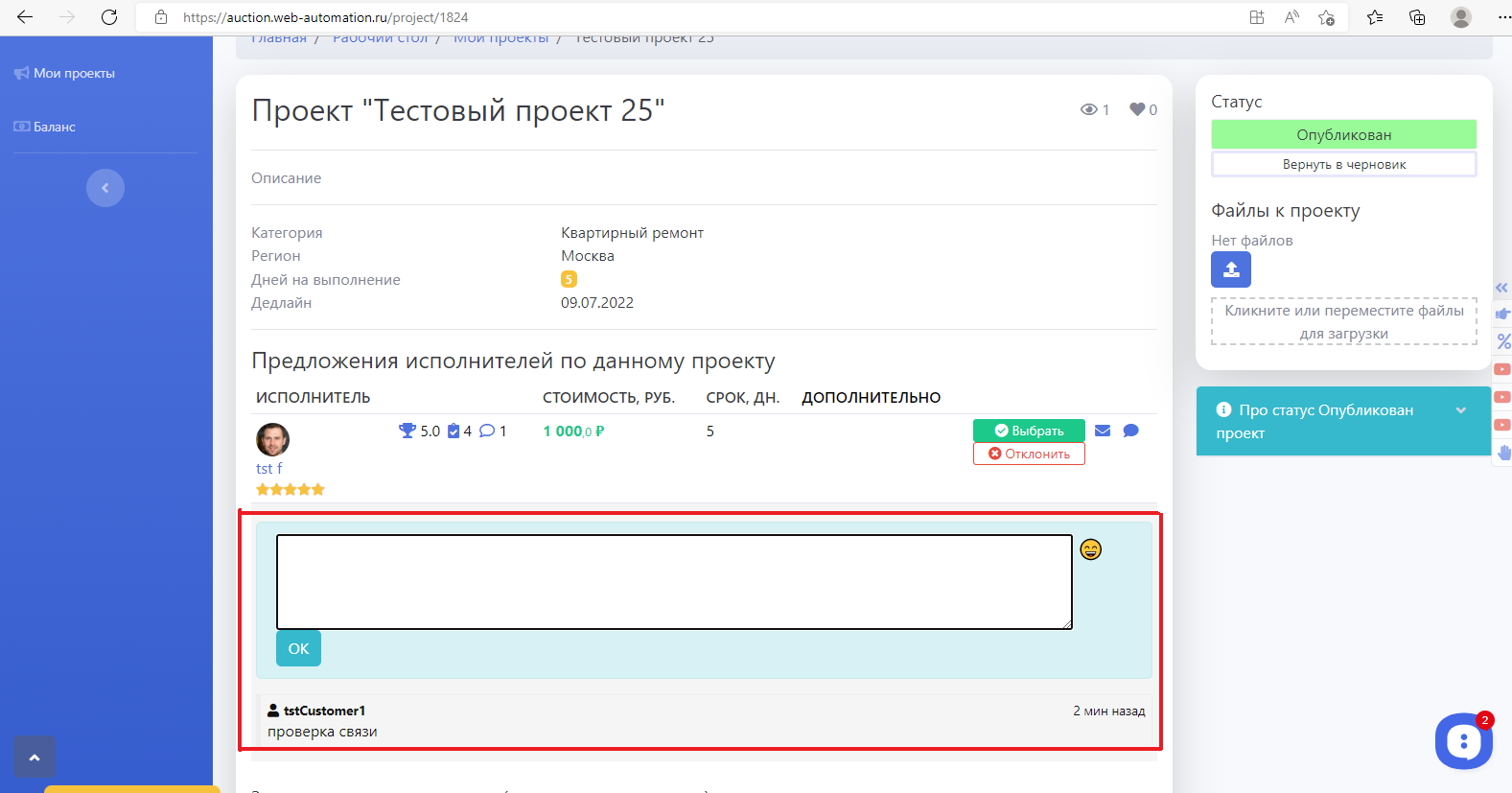 После нажатия на кнопку "комментарии" откроется форма в которой можно вести диалог с Исполнителем: