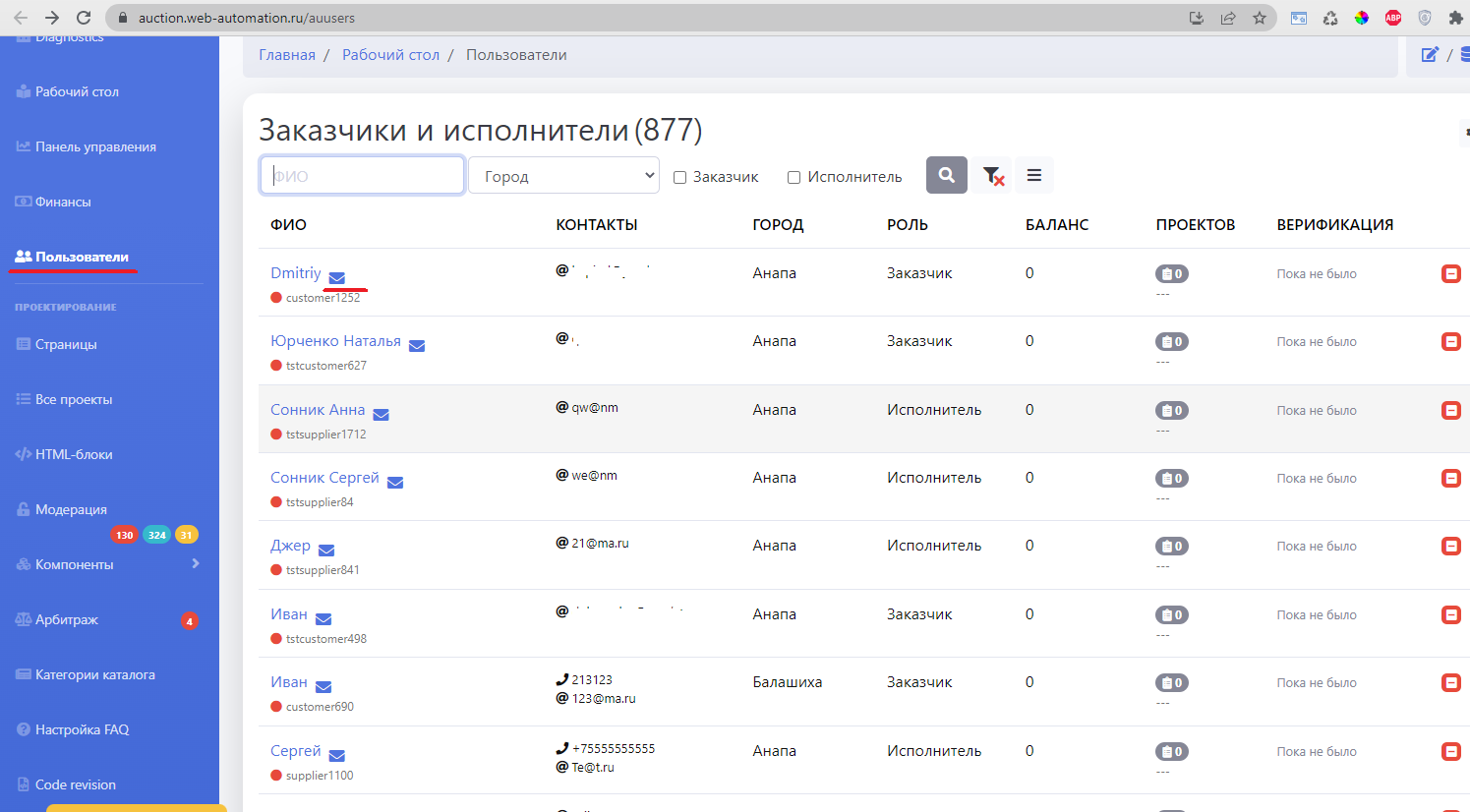 Администратор может вести переписку как с Исполнителем так и с Заказчиком. Для этого в личном кабинете администратора нужно выбрать пункт меню "Пользователи" и нажать на конверт с именем нужного пользователя: