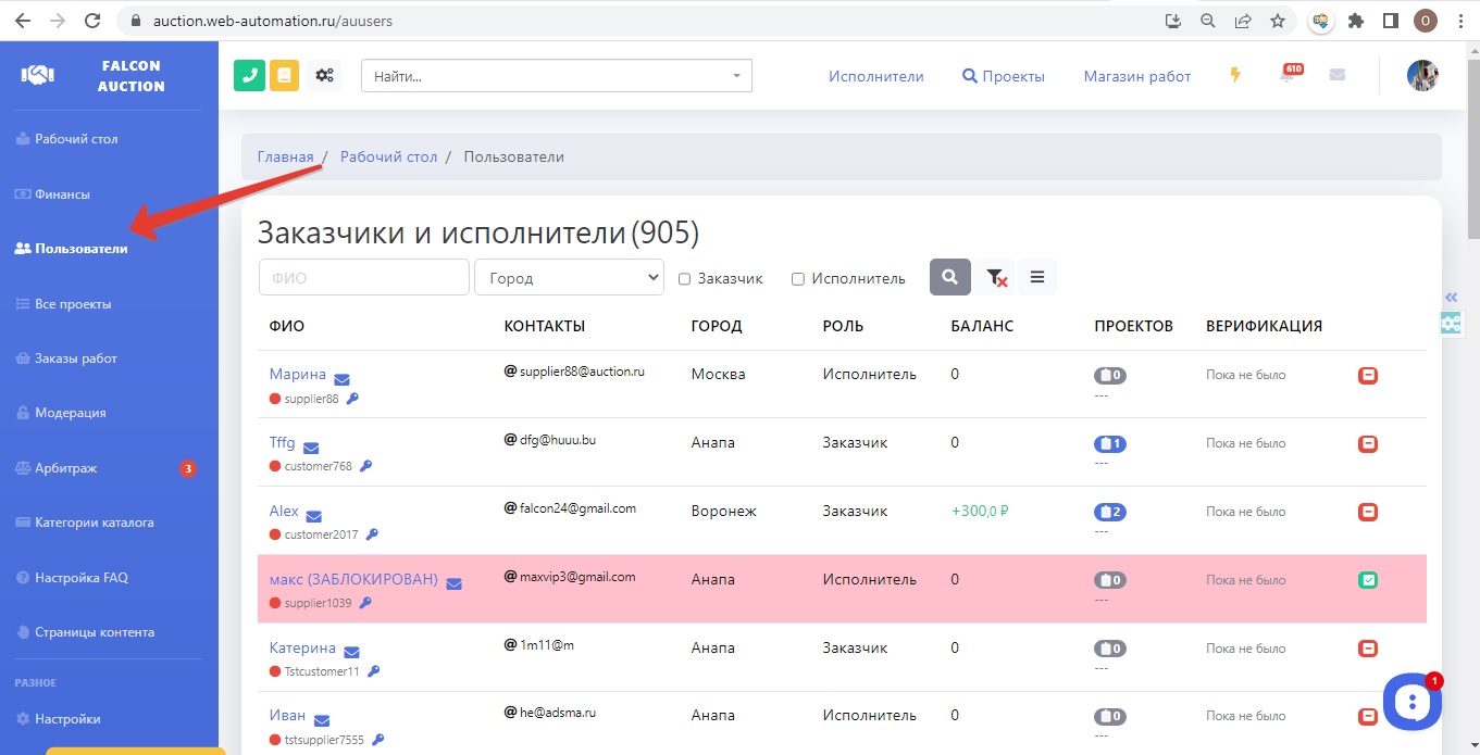 У администратора есть возможность просмотреть в своем кабинете все данные по новым пользователям, а также заблокировать их на странице Пользователи (/auusers).