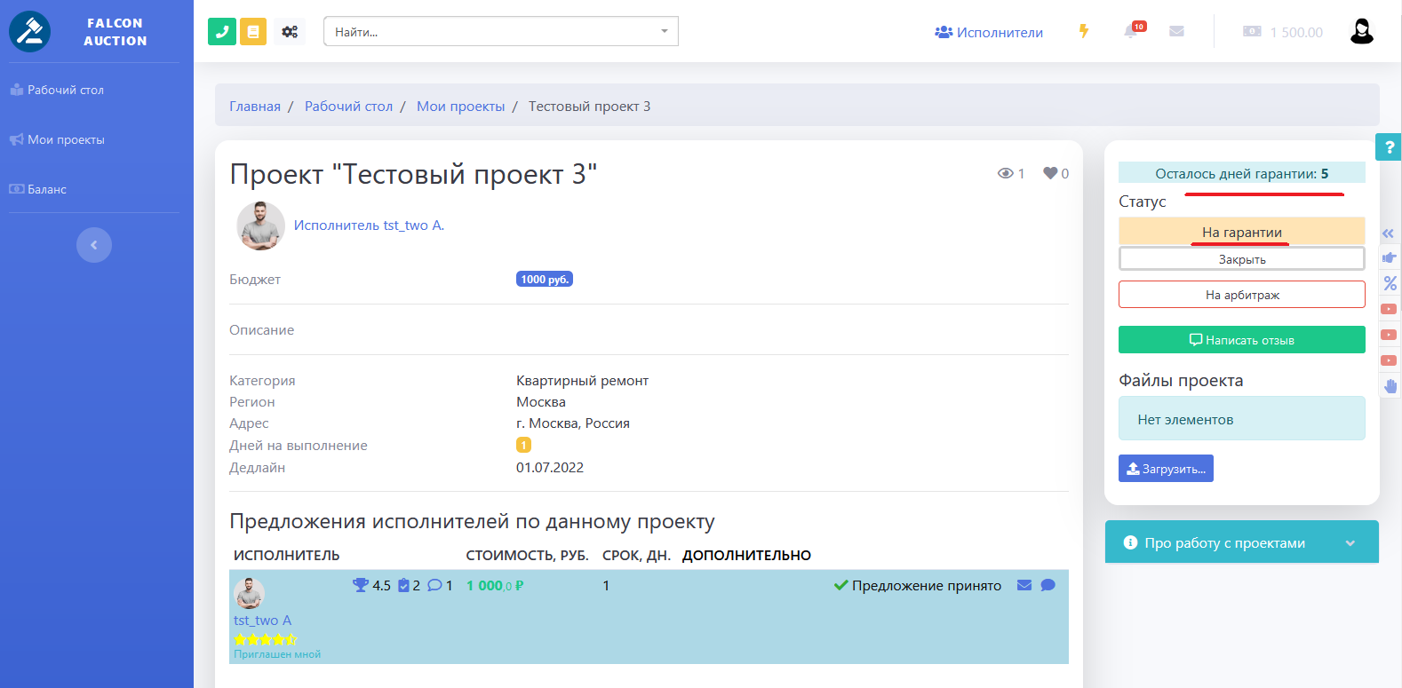 После того как Заказчик устанавливает статус проекта в "Принять работу", на странице проекта появляется возможность обратиться в арбитраж, а также указывается количество дней гарантии.