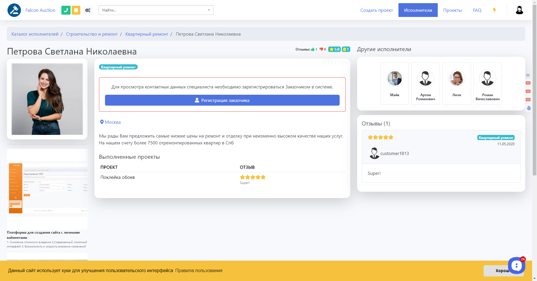 Не авторизованному пользователю доступна лишь часть информации об исполнителе, для показа полной информации, а также для связи с исполнителем требуется авторизация либо регистрация на площадке.