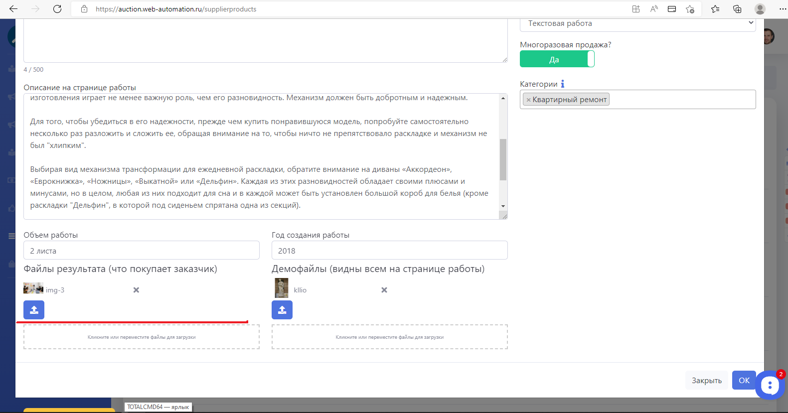 Файлы результата - это файлы, которые являются конечным результатом для Заказчика. Они будут доступны для заказчика в разделе Мои заказы.