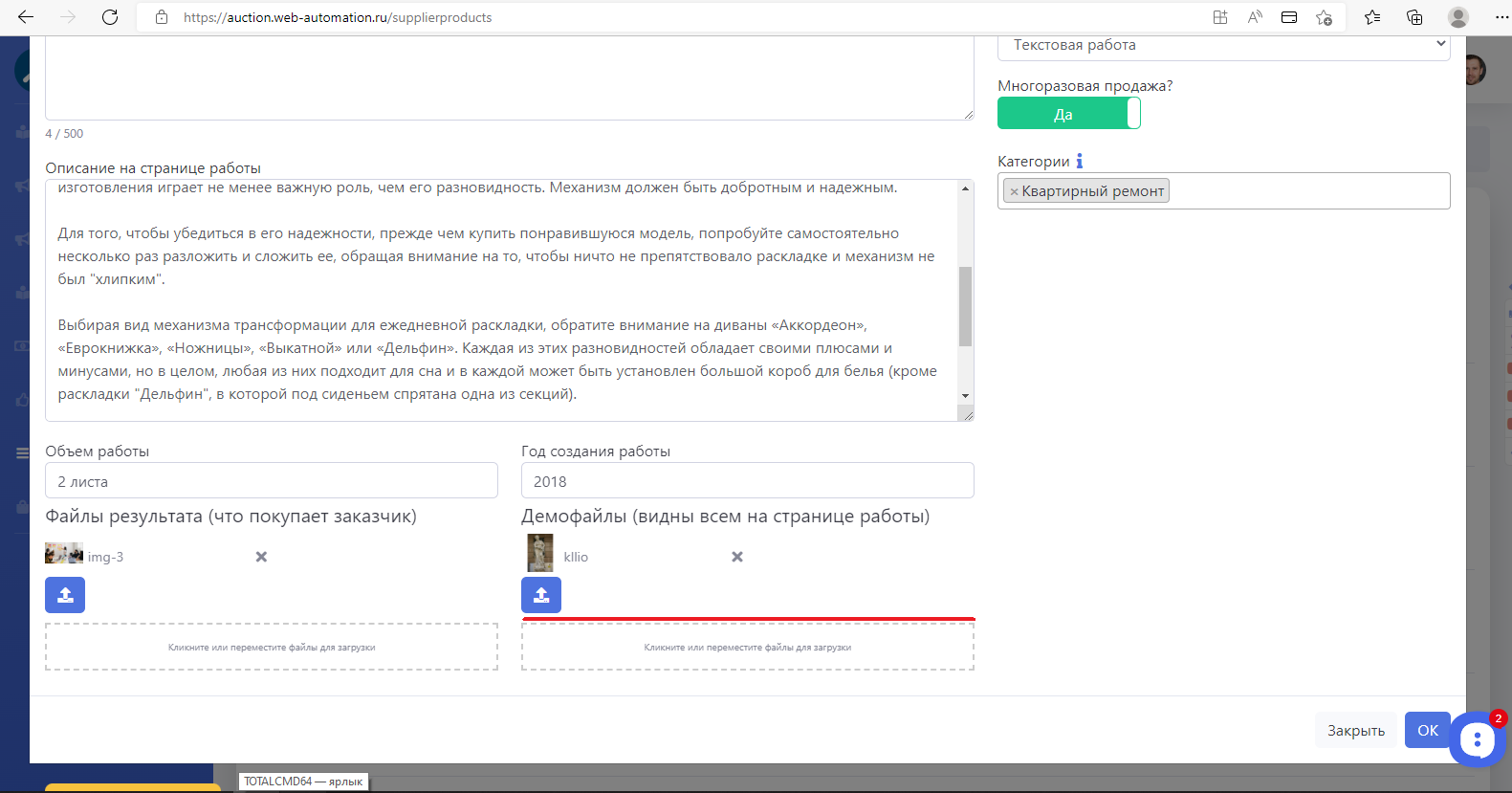 Файлы демо - эти файлы показывают часть работы. Их может видеть любой пользователь на карточке опубликованных работ в каталоге готовых работ.